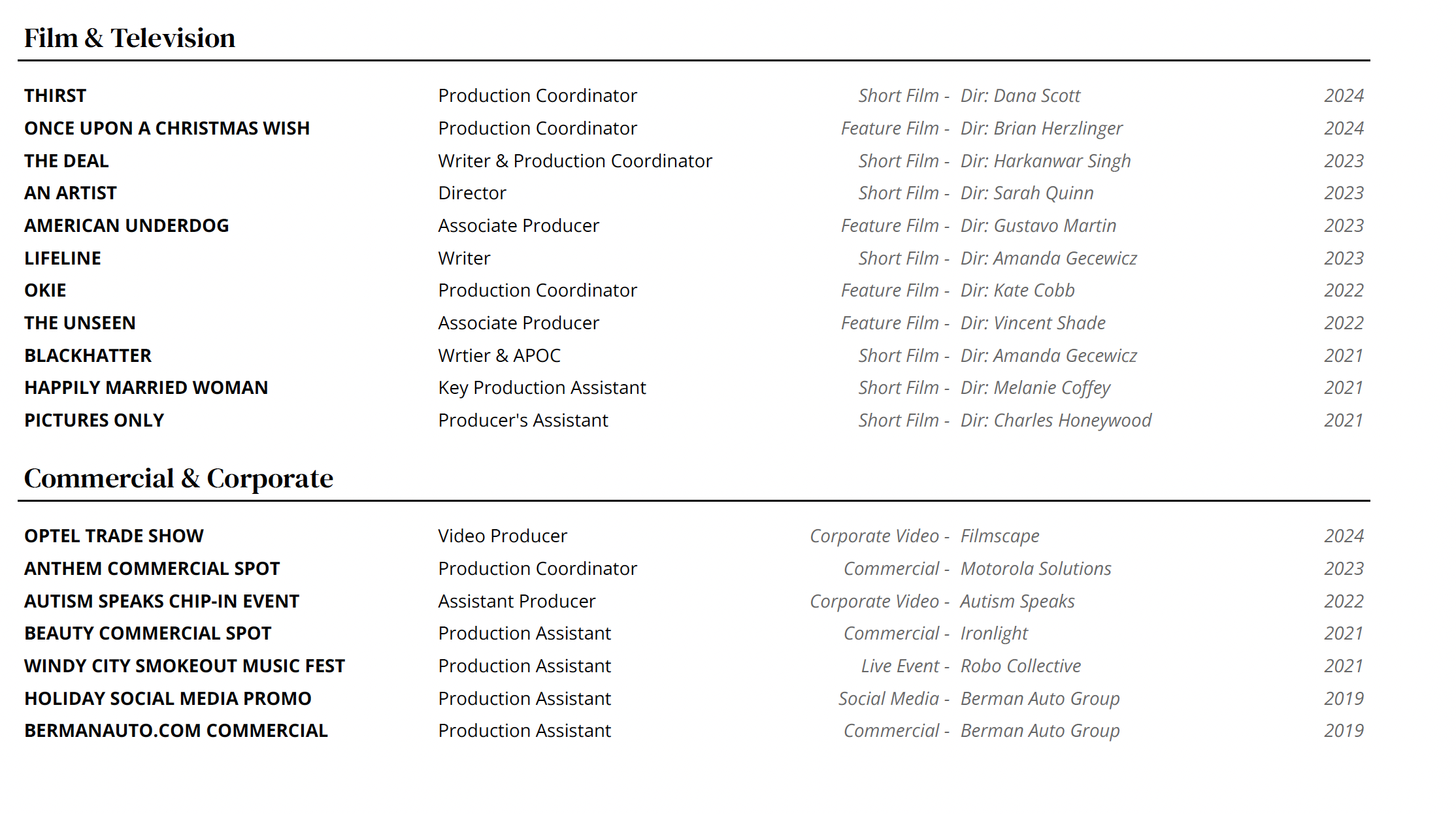 I am a freelance filmmaker and video producer. I have experience as a producer, writer, director, and production coordinator. I have a love for storytelling and bring that passion to every project I work on.